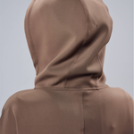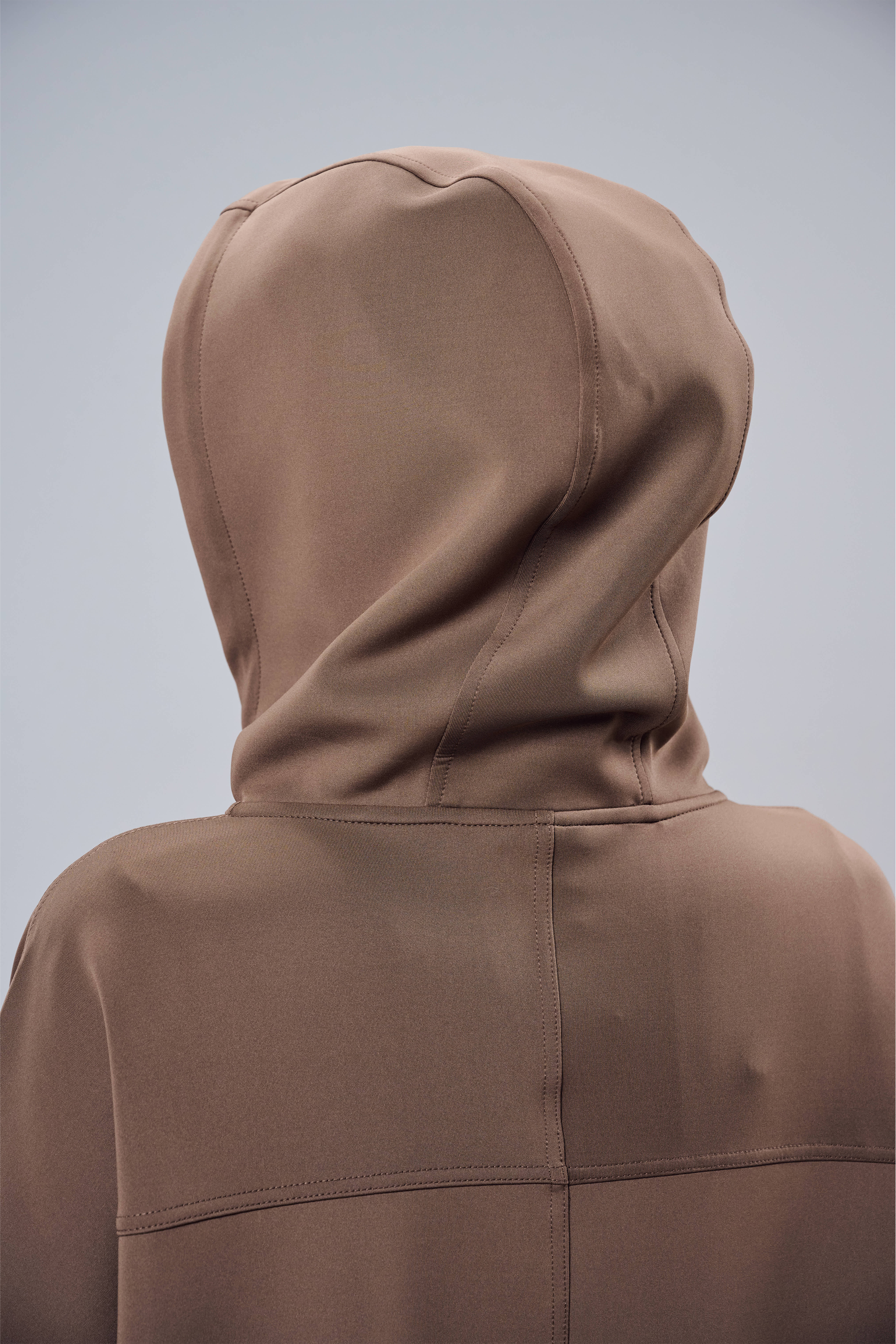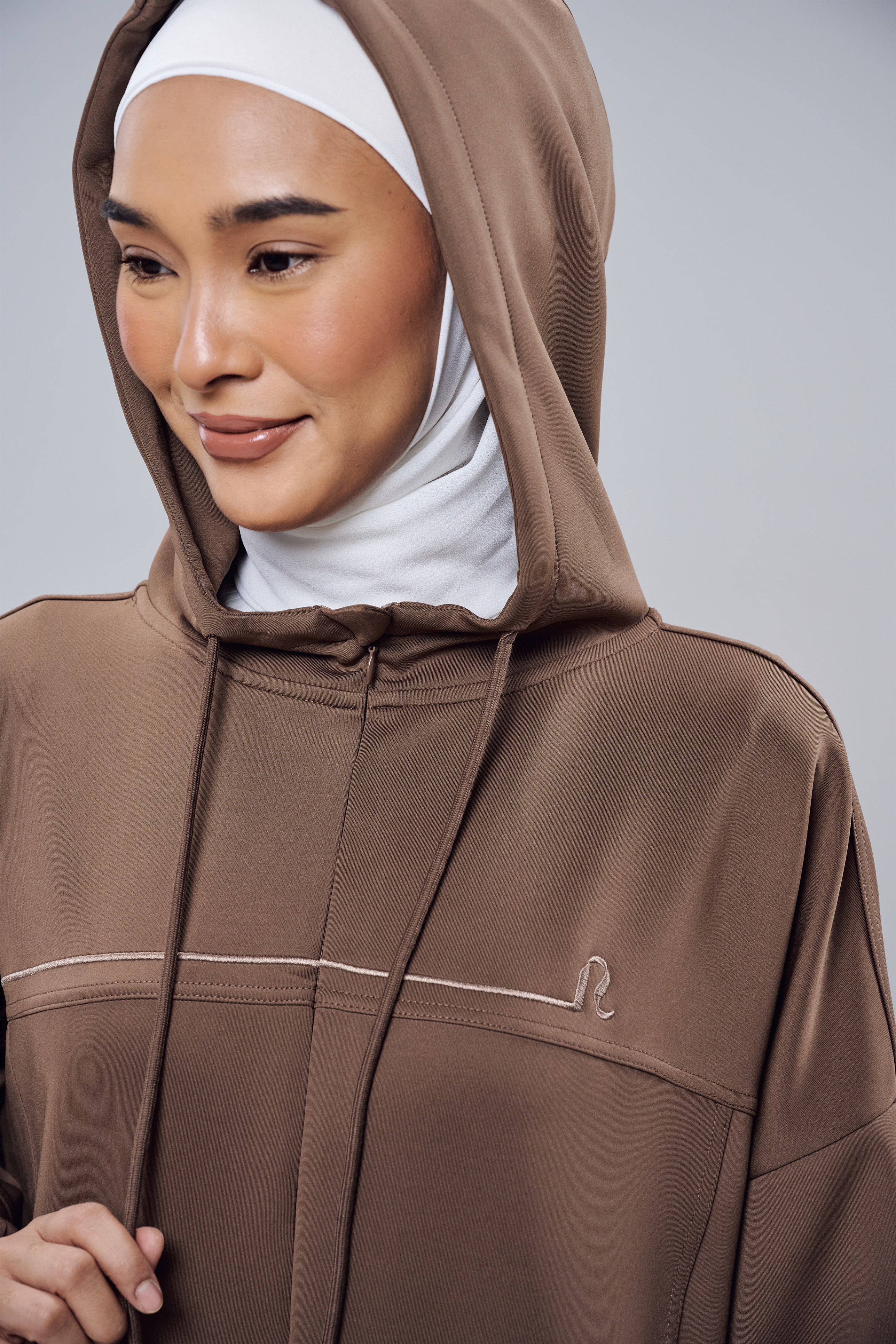 The high neckline with an attached 3-panel hoodie adds a polished sporty touch, while the curved hem side detailing keeps the silhouette flattering and modest.