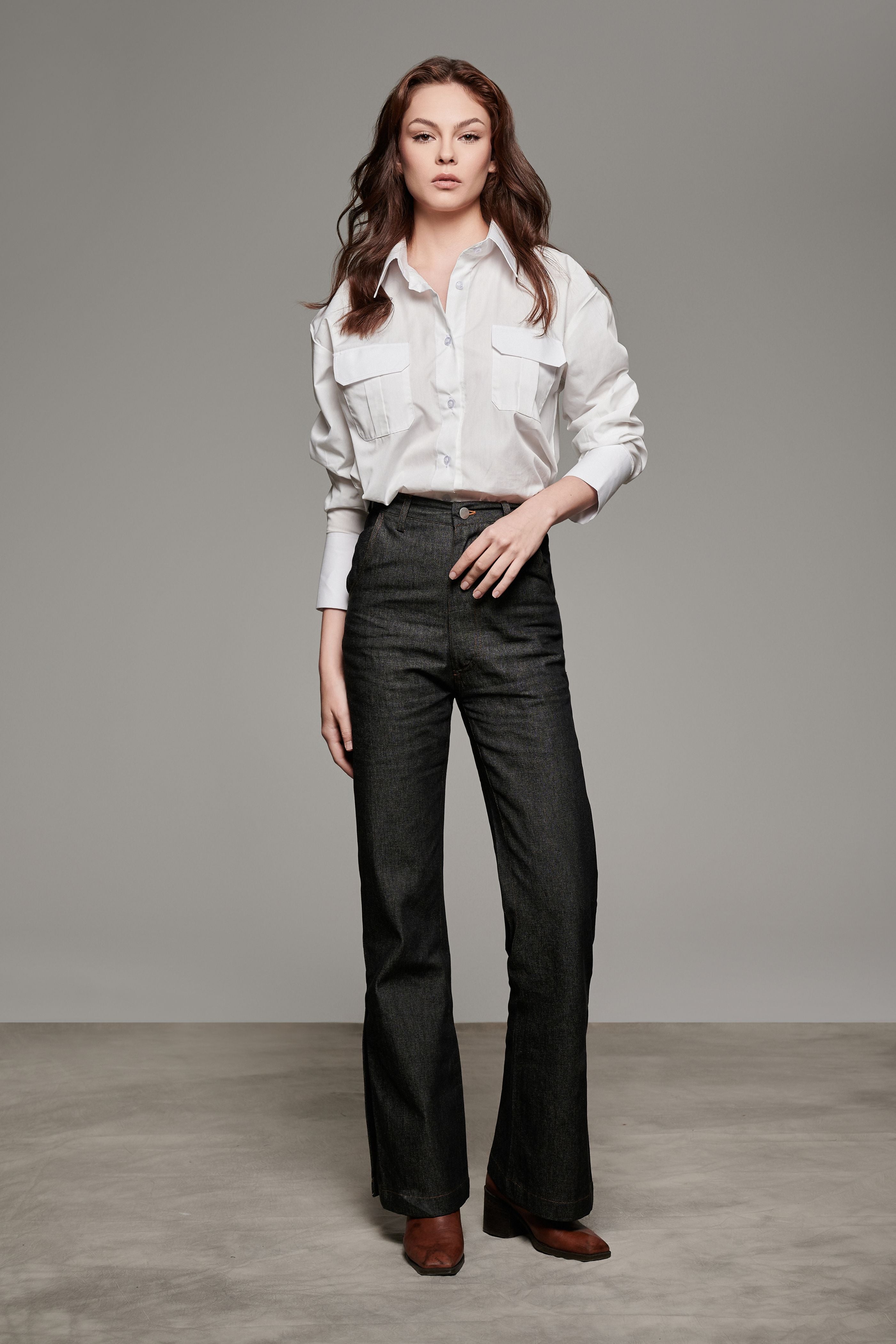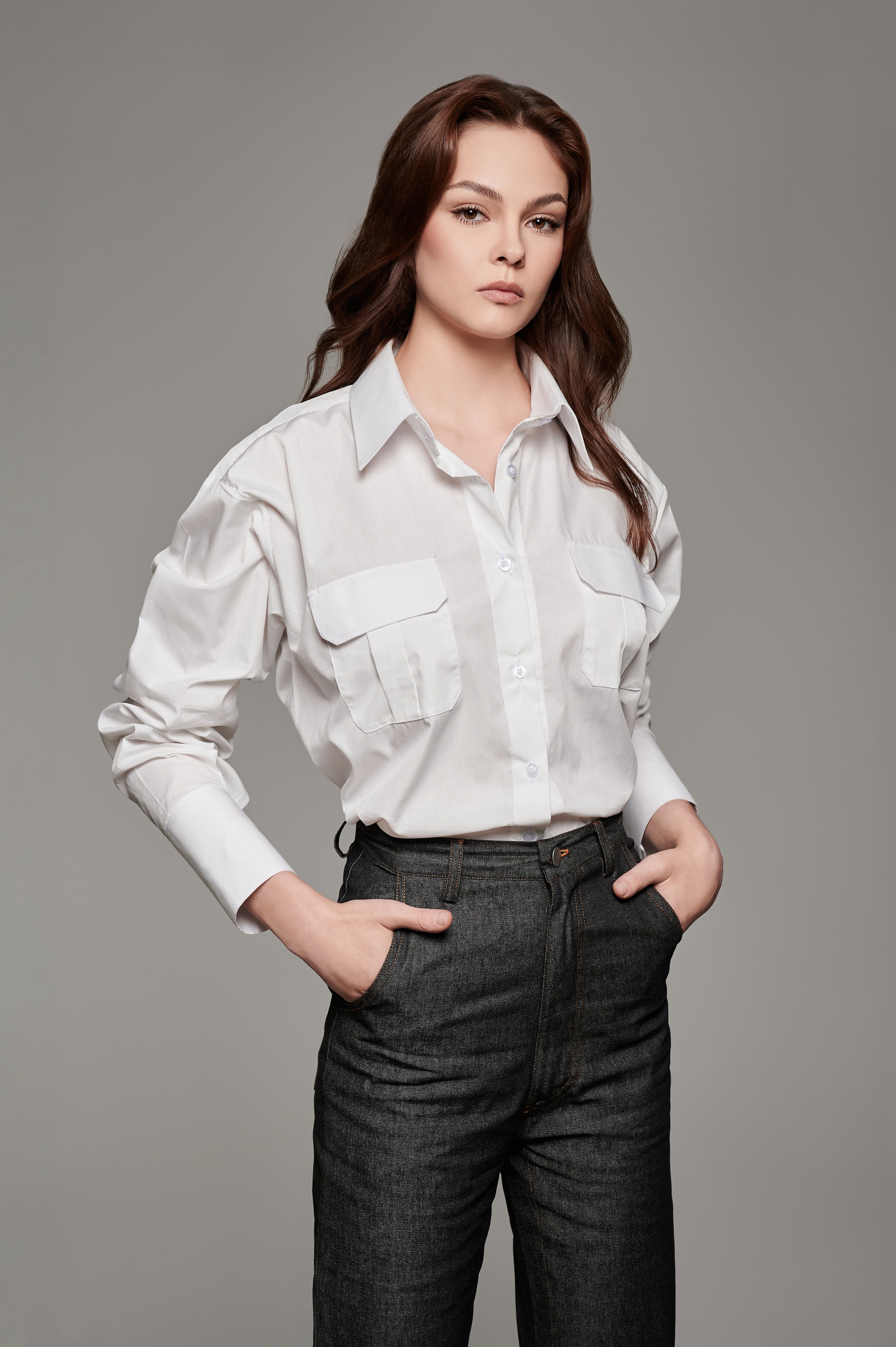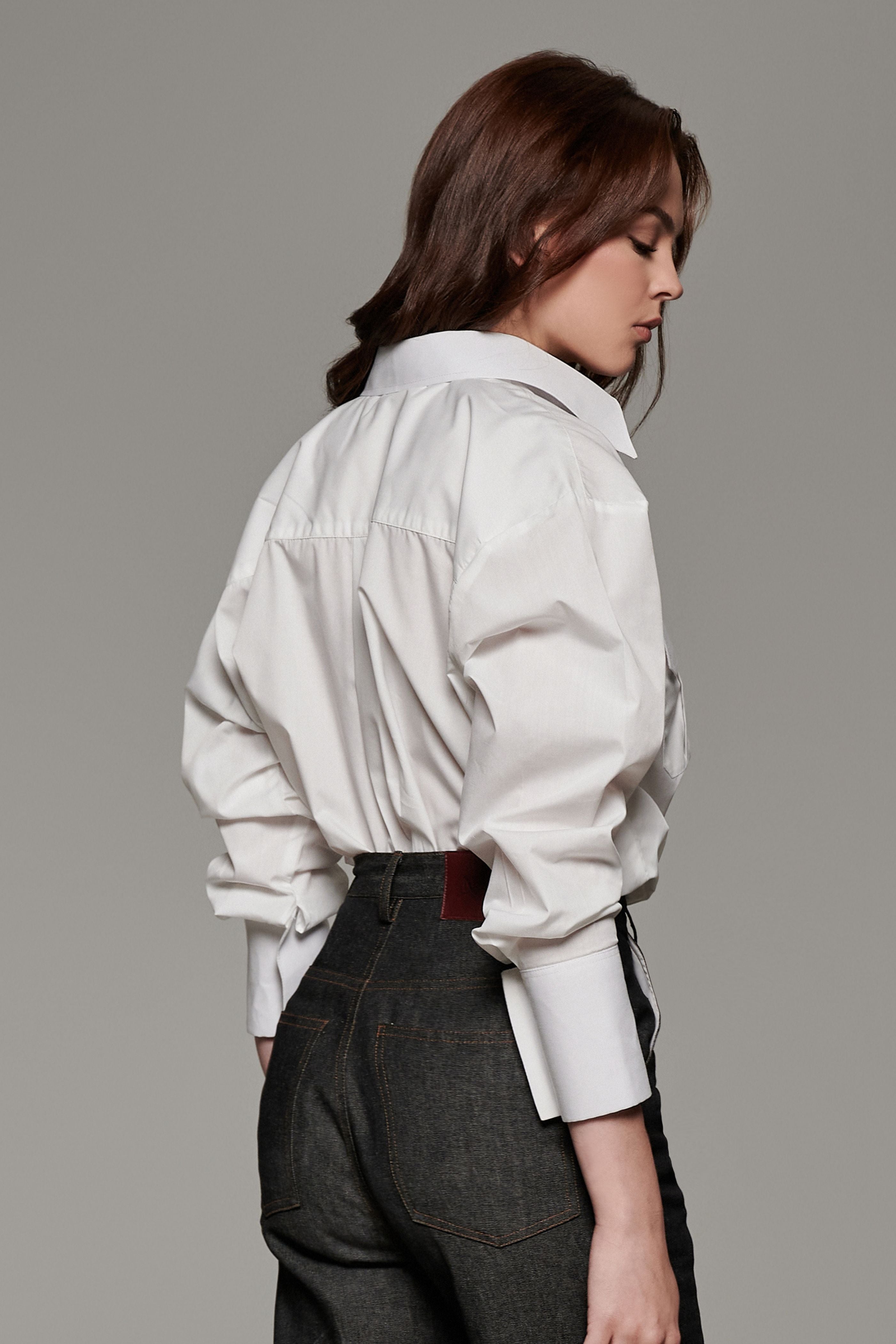Complement the Denim look with the Adrianne shirt in White. Style it up tucked-out or tucked-in for that relaxed chic look!