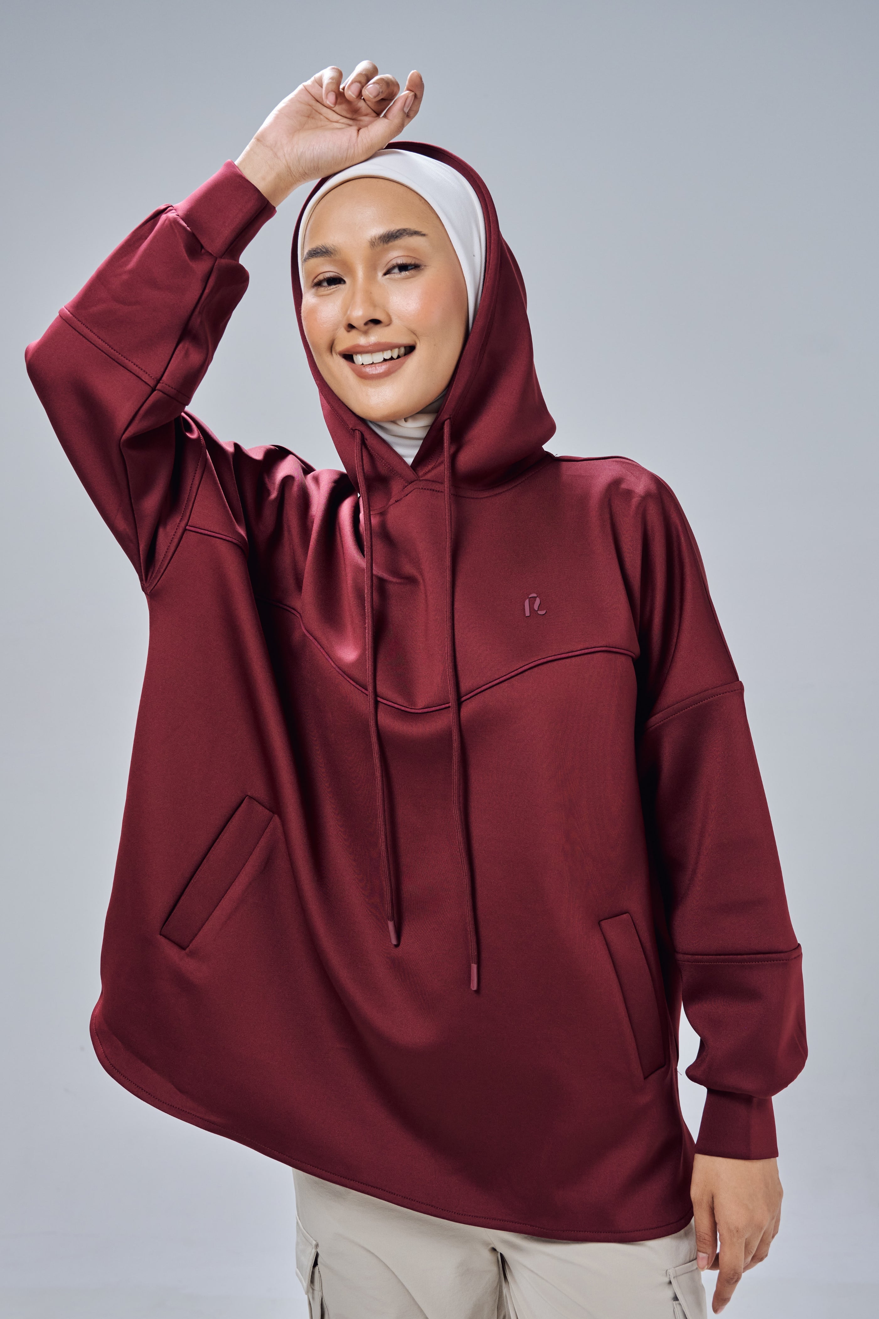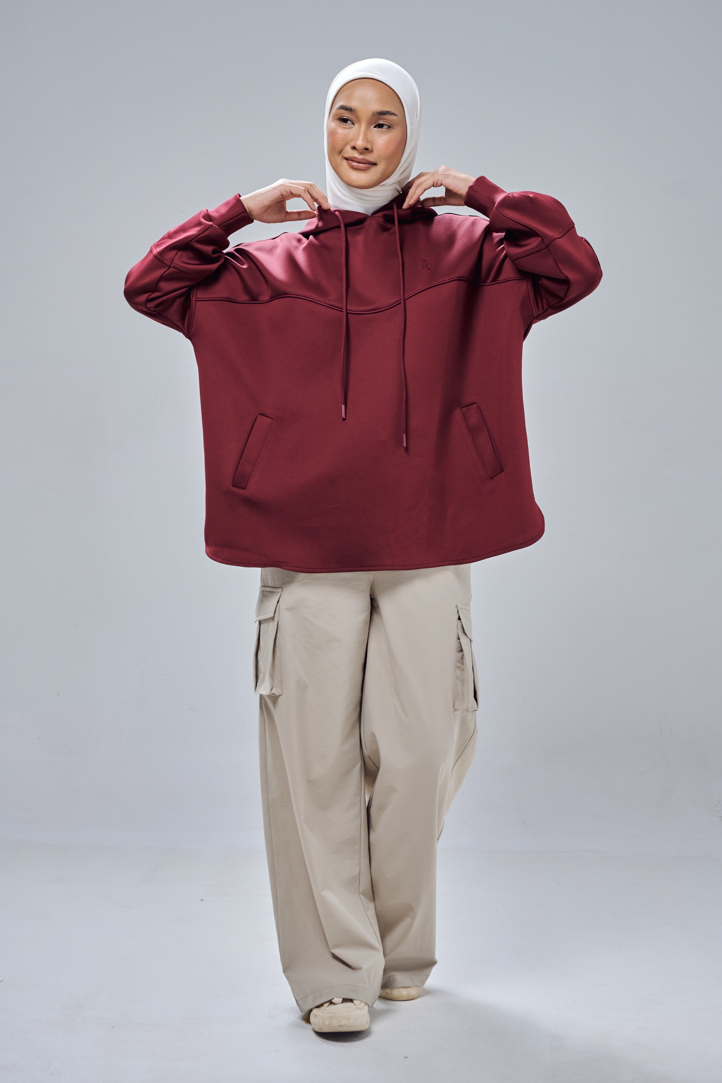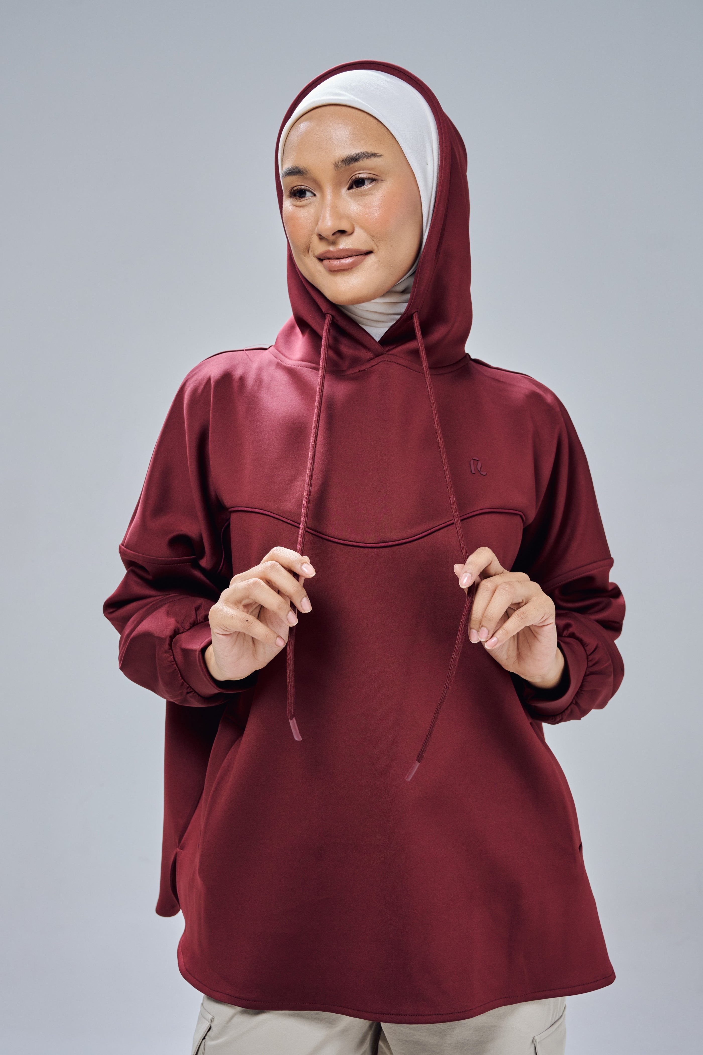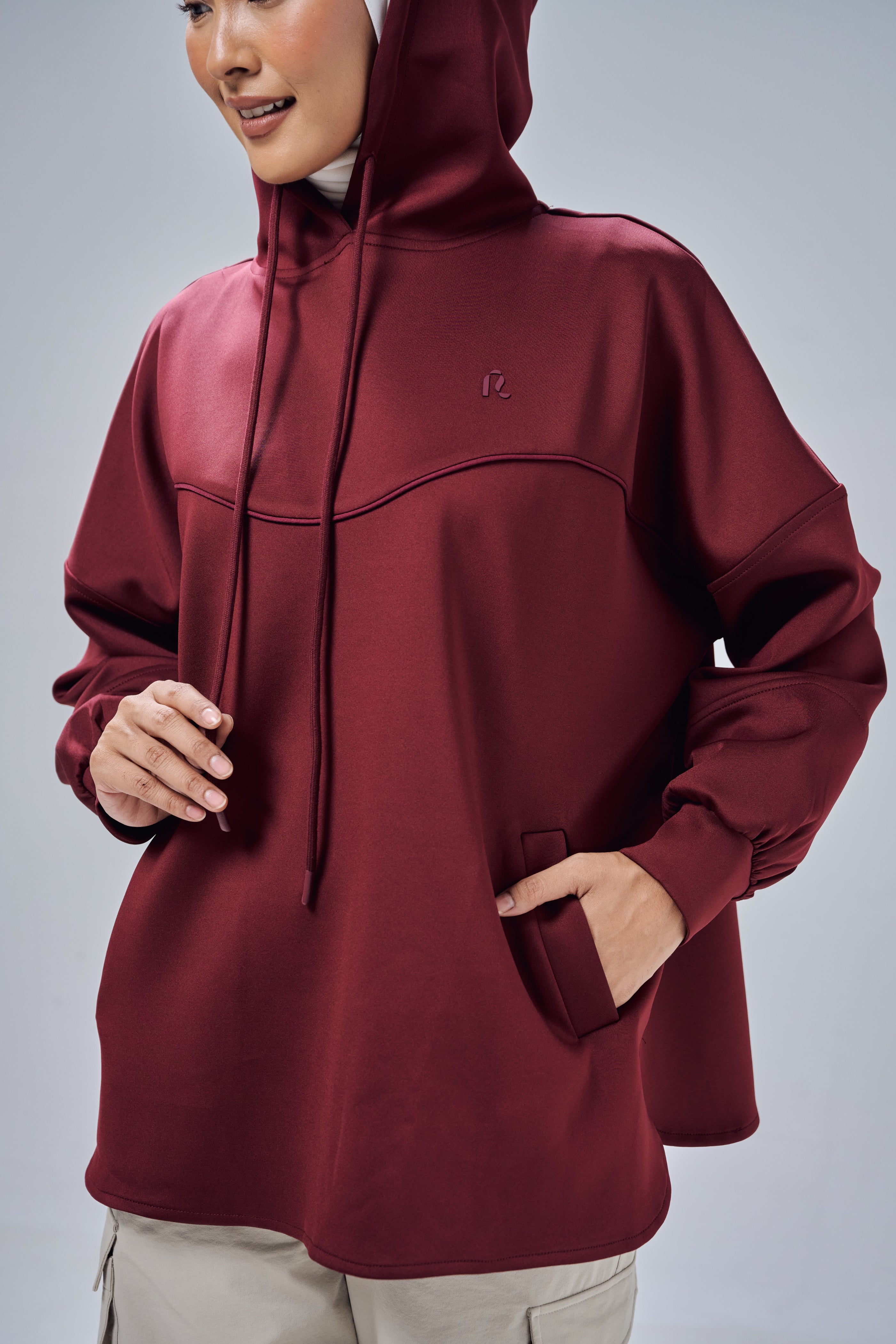 Made to be your favourite piece for on-the-go and travelling occassions, Nadine Hoodie Top comes with practical elements such as attached hoodie with strap, two front pockets and a modest cutting design. It's meant to be easy to wear and quickly gives you that stylish modest chic look.
